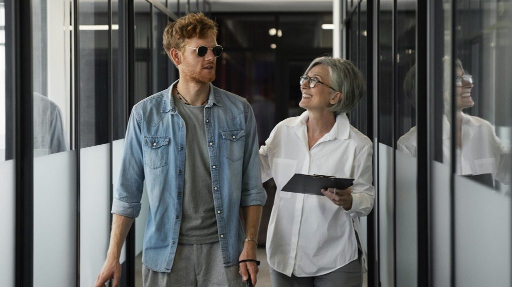 Потребна е обука на персоналот за комуникација со слепи лица, потребно е да се обезбеди пристапност во просторот: Брајови ознаки, аудио-системи, тактилни патеки, чекални и тоалети со адаптирани ознаки,како и користење контрастни бои и јасна сигнализација (некои лица имаат делумен вид), јасна вербална комуникација и почитување на личноста на слепото лице.
